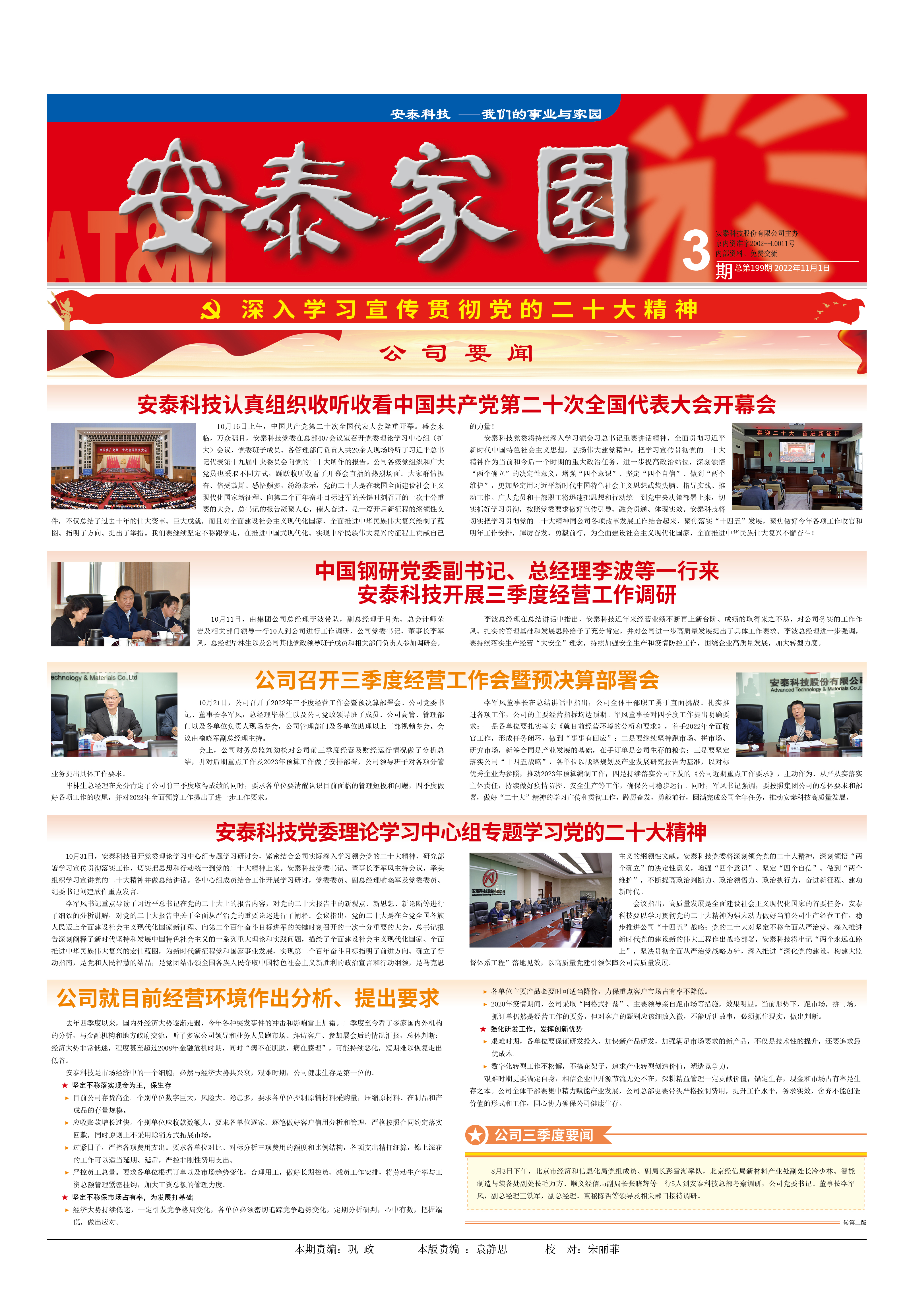 安泰科技黨委將持續深入學習領會習總書記重要講話精神,全面貫徹習近平新時代中國特色社會主義思想,弘揚偉大建黨精神,把學習宣傳貫徹黨的二十大精神作為當前和今后一個時期的重大政治任務,進一步提高政治站位,深刻領悟“兩個確立”的決定性意義,增強“四個意識”、堅定“四個自信”、做到“兩個維護”,更加堅定用習近平新時代中國特色社會主義思想武裝頭腦、指導實踐、推動工作。廣大黨員和干部職工將迅速把思想和行動統一到黨中央決策部署上來,切實抓好學習貫徹,按照黨委要求做好宣傳引導、融會貫通、體現實效。安泰科技將切實把學習貫徹黨的二十大精神同公司各項改革發展工作結合起來,聚焦落實“十四五”發展,聚焦做好今年各項工作收官和明年工作安排,踔厲奮發、勇毅前行,為全面建設社會主義現代化國家,全面推進中華民族偉大復興不懈奮斗!