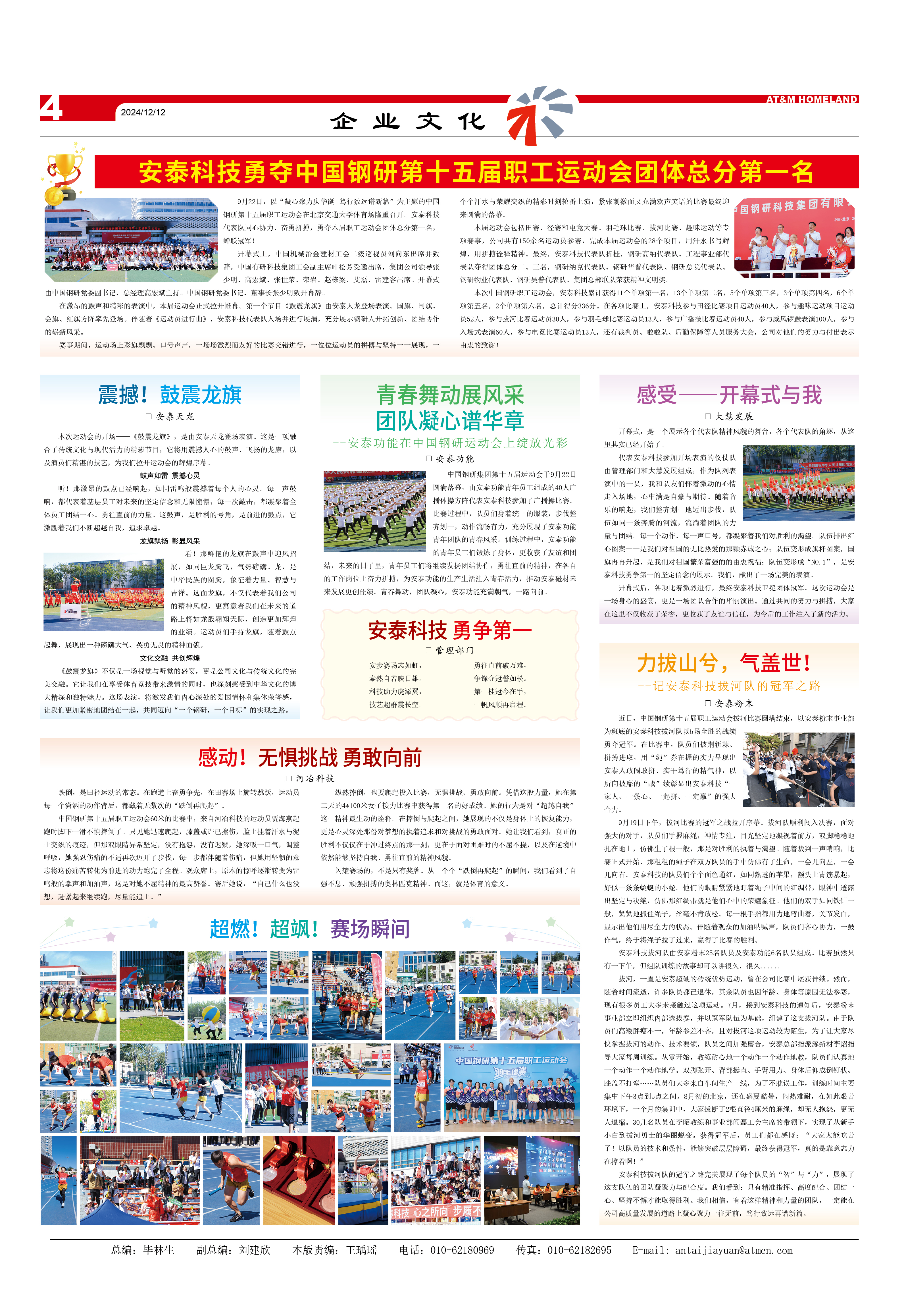 本次中國鋼研職工運動會,安泰科技累計獲得11個單項第一名,13個單項第二名,5個單項第三名,3個單項第四名,6個單項第五名,2個單項第六名,總計得分336分。在各項比賽上,安泰科技參與田徑比賽項目運動員40人,參與趣味運動項目運動員52人,參與拔河比賽運動員30人,參與羽毛球比賽運動員13人,參與廣播操比賽運動員40人,參與威風鑼鼓表演100人,參與入場式表演60人,參與電競比賽運動員13人,還有裁判員、啦啦隊、后勤保障等人員服務大會,公司對他們的努力與付出表示由衷的致謝!
